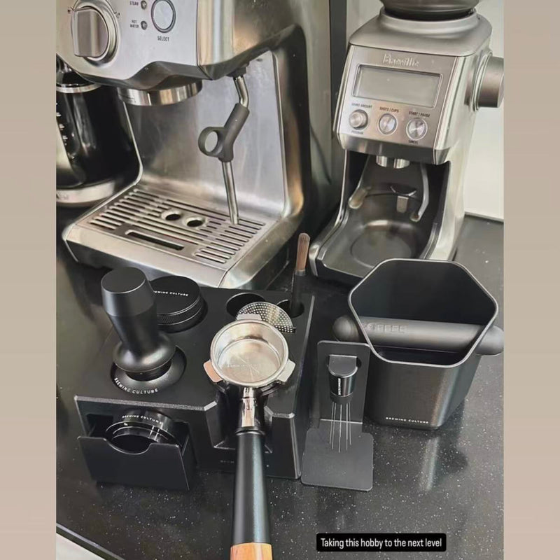 Crafted from solid Mahogany wood, this tamping station holds your portafilter securely while adding natural elegance to your bench. Dedicated compartments keep all your tools neatly in reach, and the compact size (250 × 100 × 75mm) works in any space.