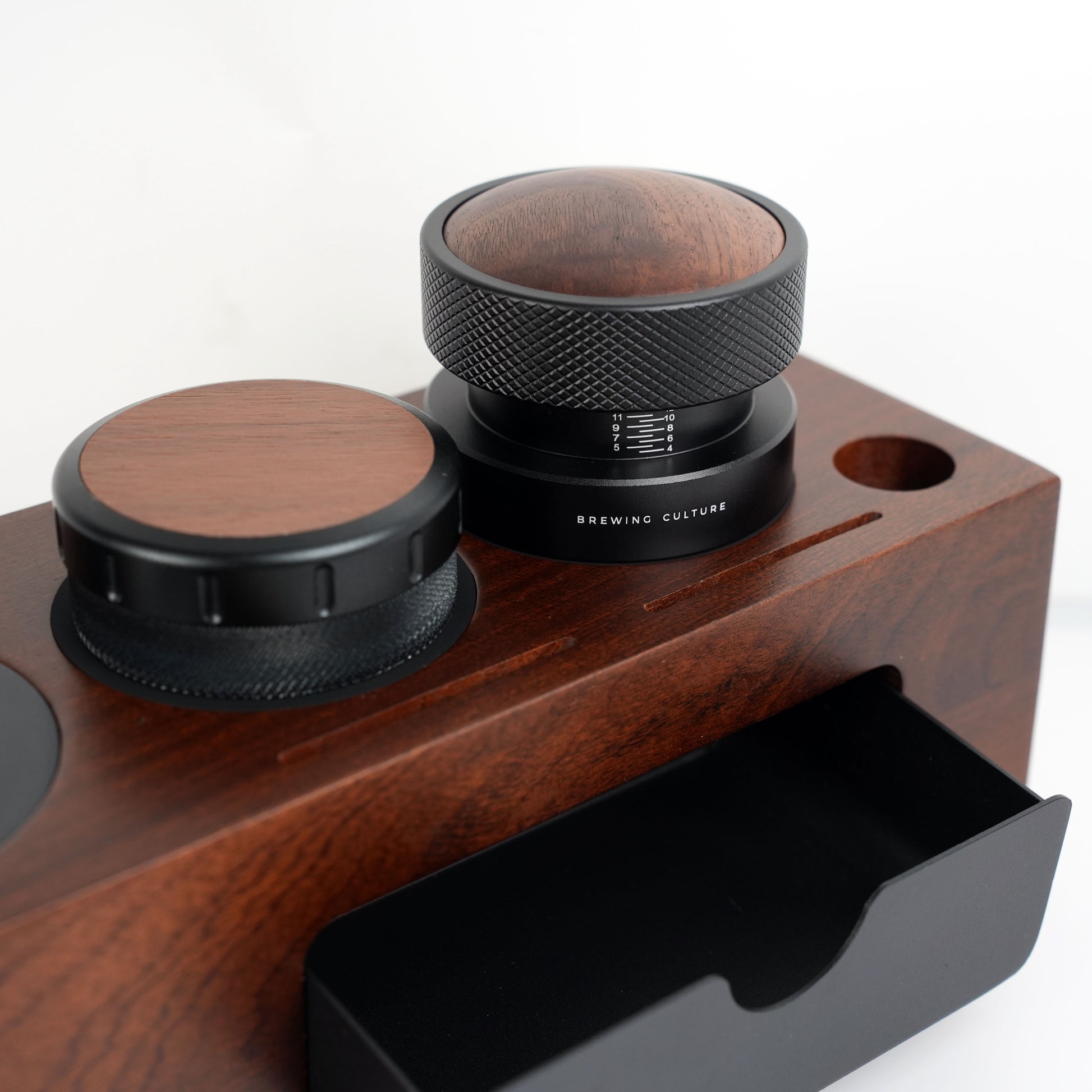 Bring elegance and organisation to your espresso setup with the BC Wooden Tamping Station Set, complete with our Walnut Top Distributor and Walnut Top Press Tamper. Designed for coffee lovers who appreciate both form and function, this set helps you streamline your workflow while elevating your countertop aesthetic.